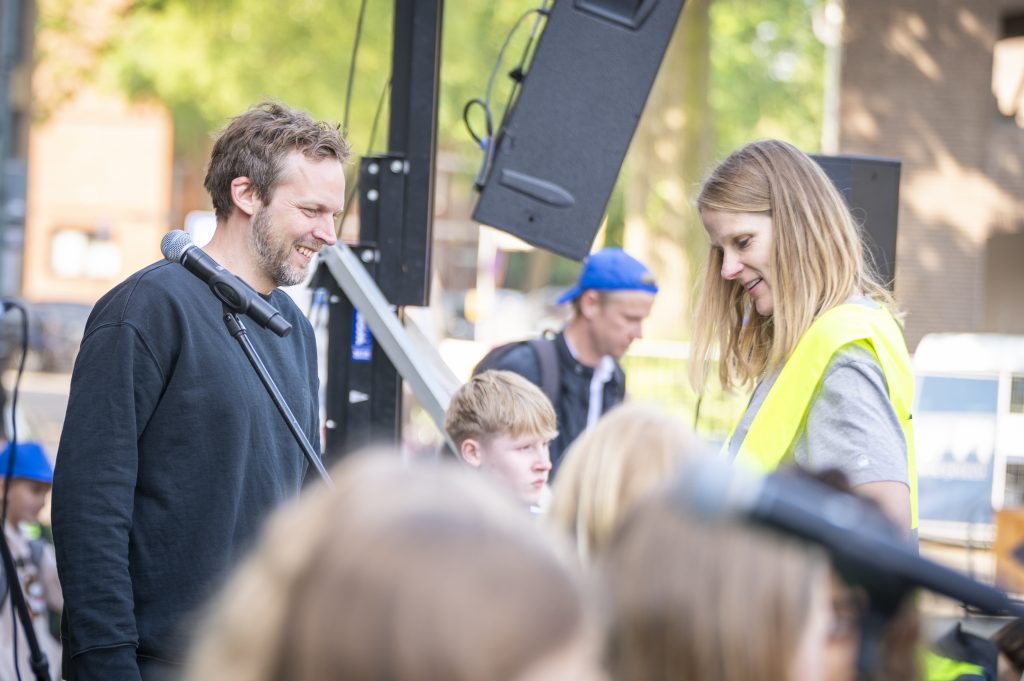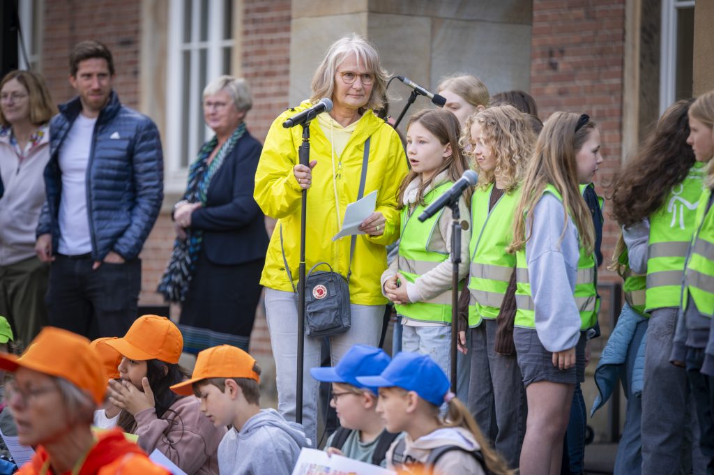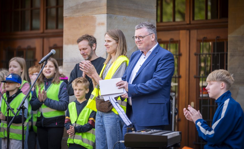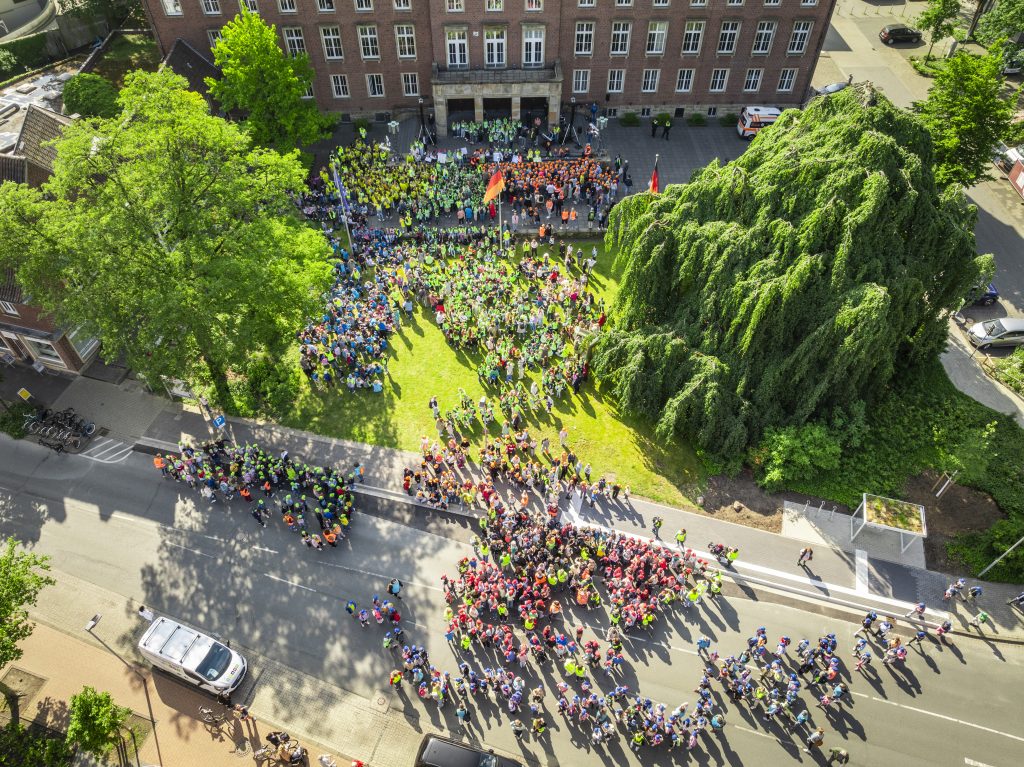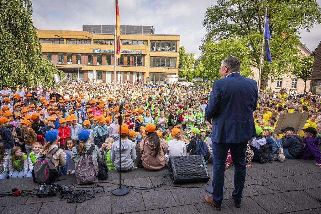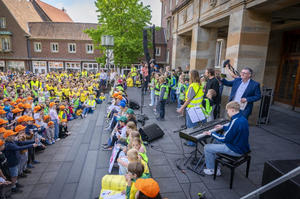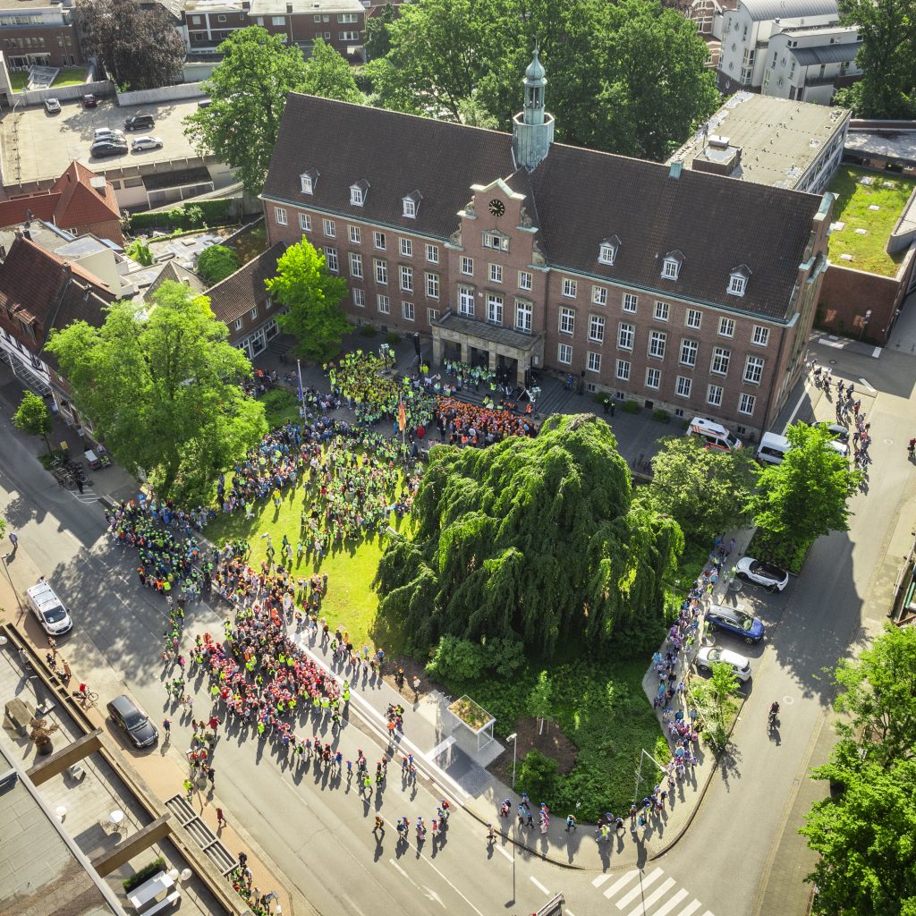 Heute sind wir mit der gesamten Schule zum Rathaus gelaufen, um gemeinsam mit etwa 2000 Schülerinnen und Schülern der Nordhorner Grundschulen unser Grundgesetz zu feiern. Nachdem alle das Lied „Menschlich“ sangen, stellten die Grundschulen jeweils einen Artikel des Grundgesetzes vor. Auch der Bürgermeister Herr Berling sprach noch zu den Kindern. Wir möchten uns an dieser Stelle für die tolle Organisation bedanken, wir hatten einen schönen und aufregenden Tag am Rathaus!